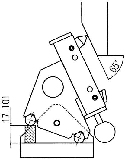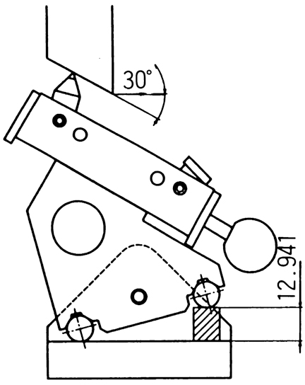 | 對于 65° 傾角: 1. 65°-45°=20° 2. Sin20°=0.34202013 . 50mm×0.3420201=17.101mm4 . 通過堆疊 17.101mm 博客規(guī)獲得 65° 傾角。  | 對于 30° 傾角: 1. 45°-30°=15° 2. Sin15°=0.258819 3. 50mm×0.258819=12.941mm 4. 通過堆疊 12.941mm 博客量規(guī)可獲得 30° 傾角。  |